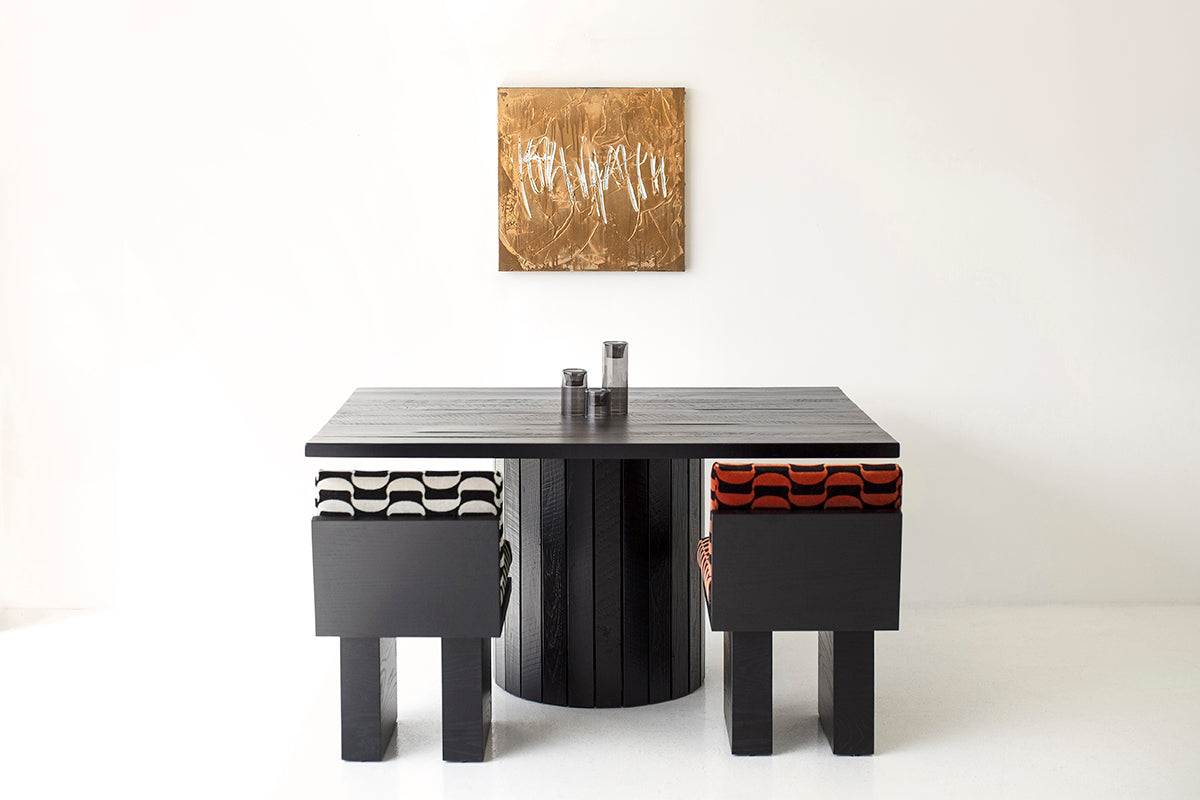 This Black Reclaimed Wood Dining Table - The Bellhop is made in the heart of Ohio with locally sourced reclaimed wood. We use the table both as a modern dining table or desk. Each table is hand-made with solid reclaimed mixed species reclaimed wood and is finished with a beautiful black commercial grade finish, or a finish of your choice! The 24" drum shaped slatted bottom offsets the crisp rectangular top. We love this one and hope you enjoy it as much as we do!