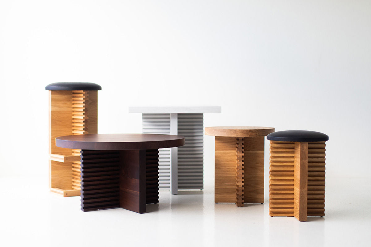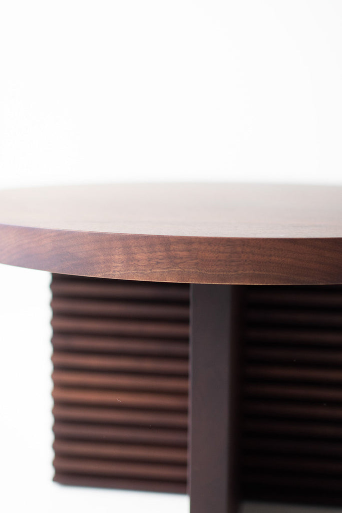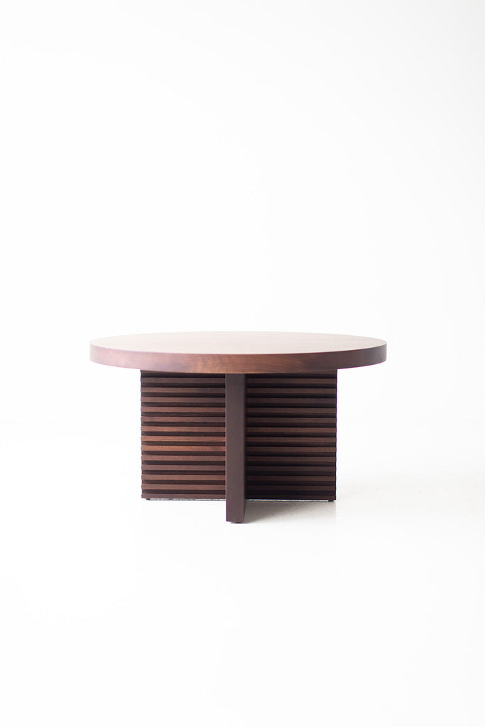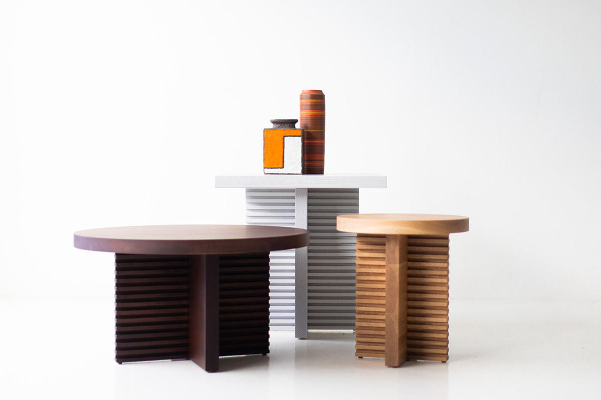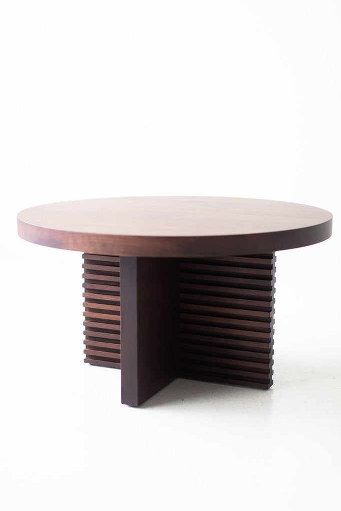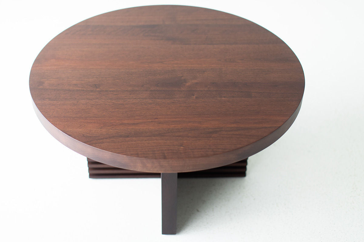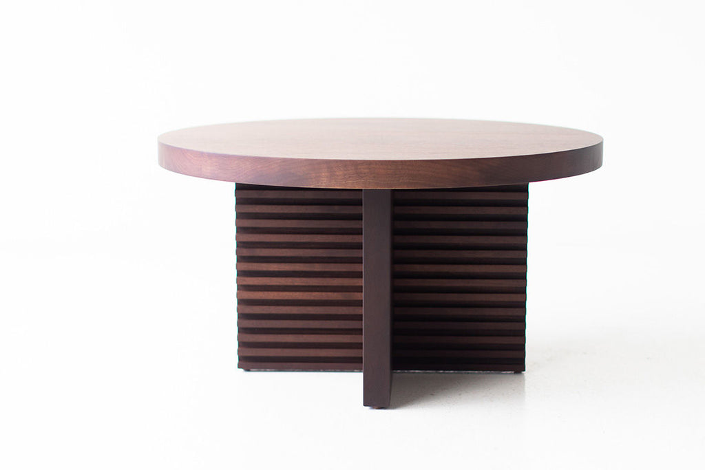 This Modern Walnut Coffee Table - The Cicely is made in the heart of Ohio with locally sourced wood. We use the table both as a coffee table or end table and can be customized as you see fit. Each table is hand-made in solid walnut and finished with a beautiful commercial-grade finish (other finishes and wood species available). We absolutely love the leg design - chunky, fresh, modern, and looks great with any aesthetic. Every piece in the Cicely Collection shares the beautiful horizontal routed pattern design.