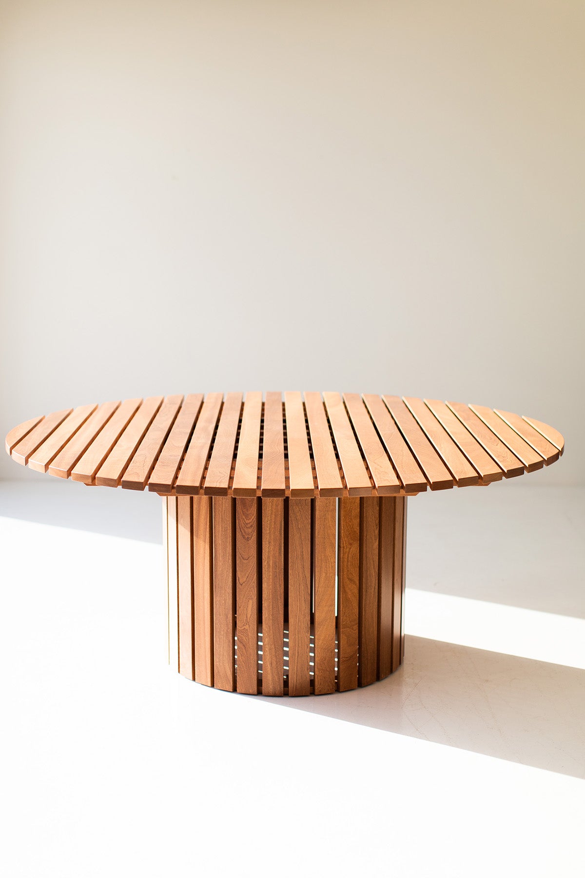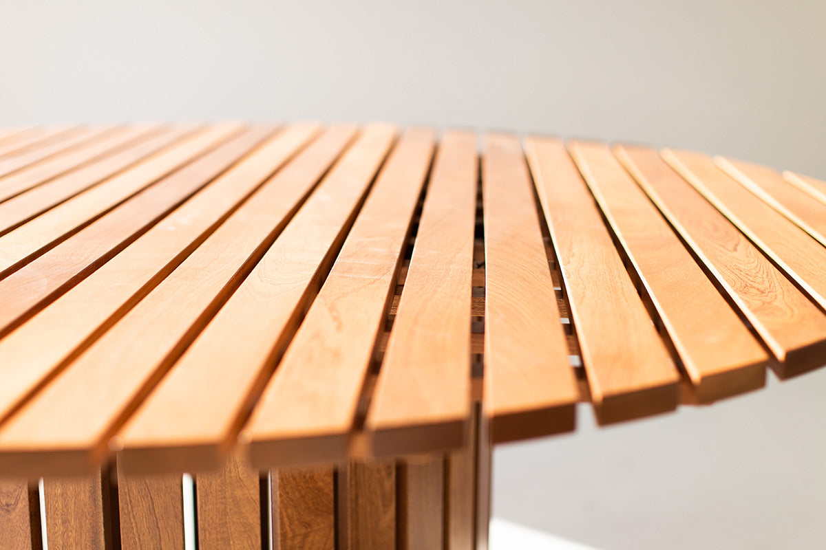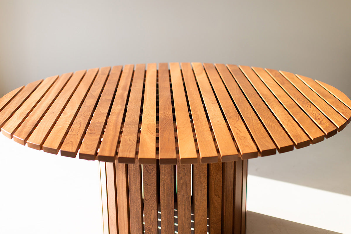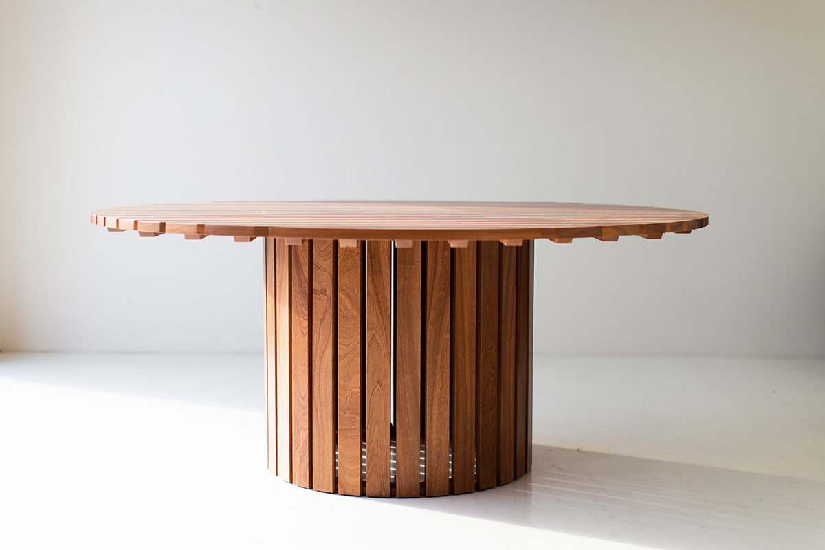 This Round Outdoor Wood Dining Table - The Hamptons is handmade in the heart of Ohio with locally sourced sapele mahogany. The wood is suitable for outdoor conditions and finished with a commercial grade exterior finish. Finish options include natural, grey-wash, dark walnut, and ebony (shown here in natural.) Samples available upon request. We love the sleek feel and versatility of this style. Contact us to customize dimensions. We love this table and hope you enjoy it as much as we do!